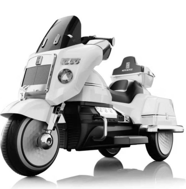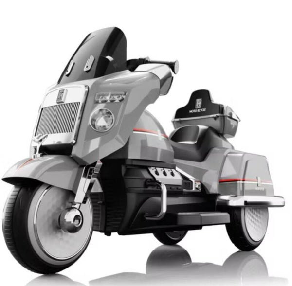 Die Vorderseite des Motorrads ist mit einem charakteristischen Rolls-Royce-Kühlergrill und runden Scheinwerfern ausgestattet. Der Sitzbereich ist geräumig und komfortabel, mit einem zusätzlichen Sitz hinten, der ebenfalls das Rolls-Royce-Logo trägt. Die Räder sind stilvoll und passen zum gesamten luxuriösen Erscheinungsbild des Motorrads.