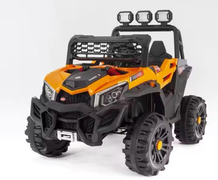 Entdecken Sie spannende Abenteuer mit diesem robusten Kinder Aufsitzauto! Das Auto ist hauptsächlich in Orange mit schwarzen Akzenten gestaltet und verfügt über große, robuste Reifen, die für unwegsames Gelände geeignet sind. Es hat einen detaillierten Frontgrill, Scheinwerfer und einen Überrollkäfig mit zusätzlichen Lichtern oben montiert. Mit einem realistischen Armaturenbrett und einem Sitzbereich sieht es aus wie eine Miniaturversion eines echten Geländewagens. Perfekt für kleine Entdecker, die gerne draußen spielen und die Welt erkunden möchten.