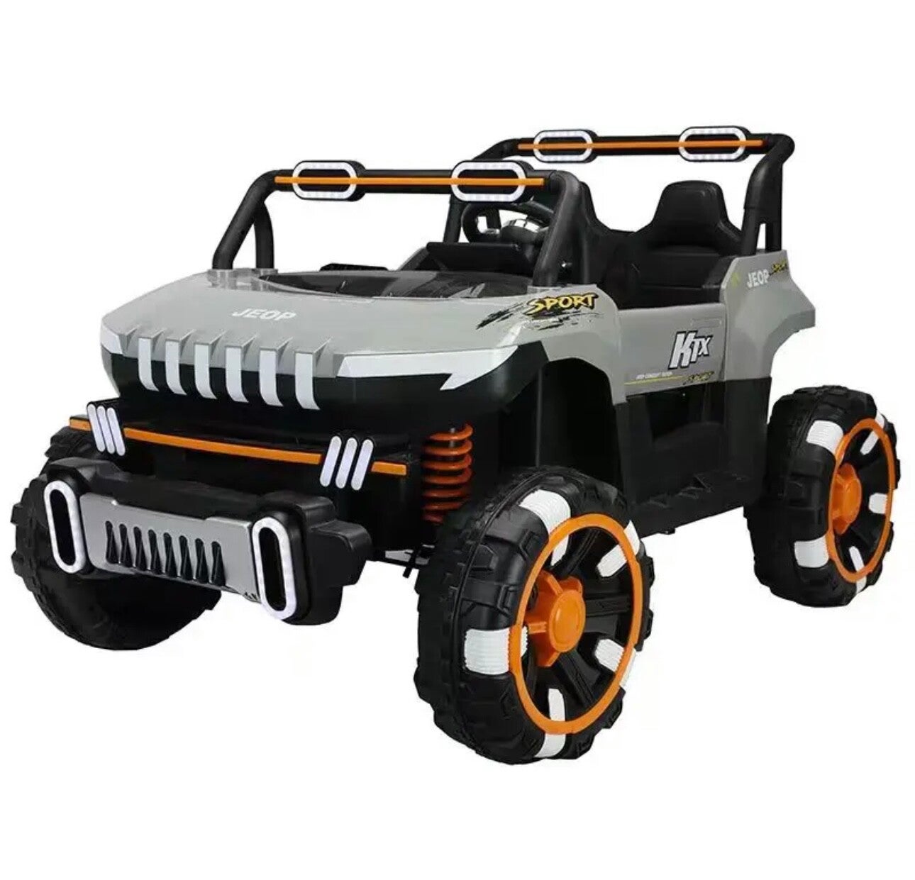 Erleben Sie aufregende Abenteuer mit dem Jeep Kinderauto "JEOP"! Dieses beeindruckende Spielzeugauto besticht durch sein kraftvolles Design, das an echte Geländewagen erinnert. Das Auto ist in Schwarz und Grau gehalten, mit auffälligen orangenen Akzenten an den Rädern und dem vorderen Stoßfänger. Die detailreiche Ausführung umfasst Scheinwerfer, einen robusten Frontgrill und große, dicke Reifen, die perfekt für unwegsames Gelände sind. Die Beschriftung "SPORT" an der Seite und "KTX" an der Tür verleiht dem Auto einen sportlichen Touch. Dieses Kinderauto bietet kleinen Abenteurern stundenlangen Spielspaß und fördert ihre Vorstellungskraft und Kreativität.