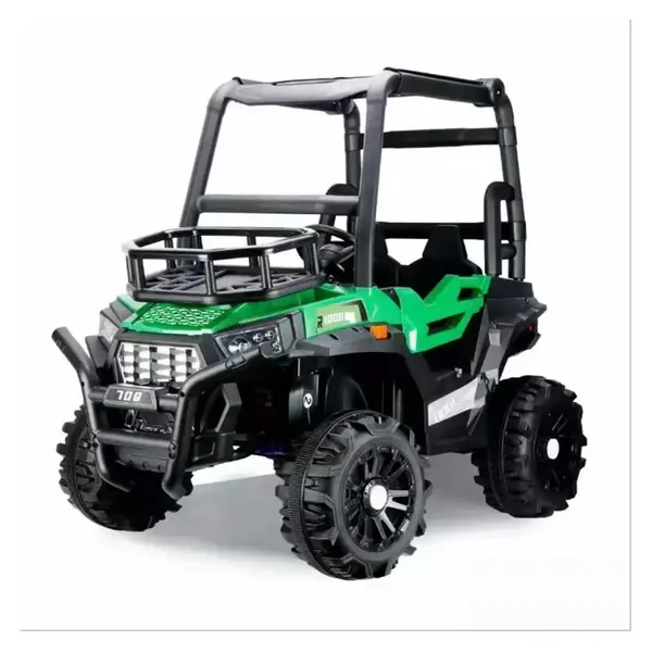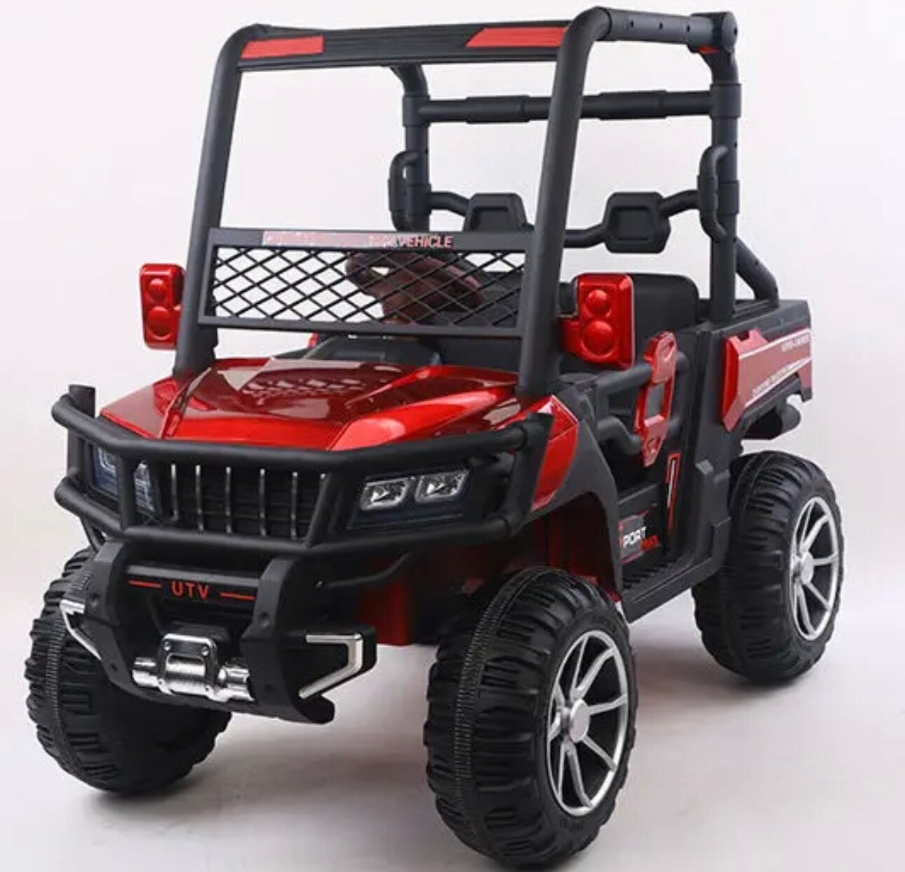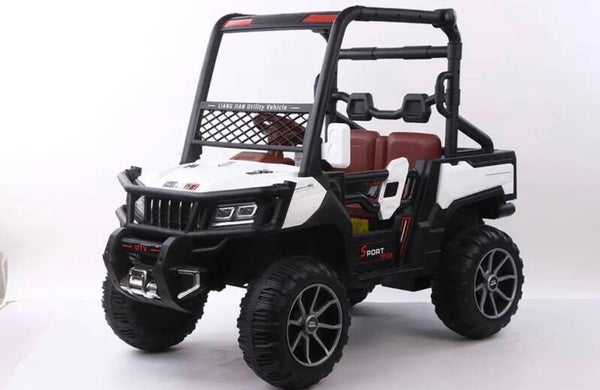 Dieses Bild zeigt ein Spielzeugfahrzeug, das wie ein Geländewagen gestaltet ist. Es hat eine robuste Bauweise mit großen, grobstolligen Reifen, die für unwegsames Gelände geeignet sind. Das Fahrzeug ist in den Farben Weiß und Schwarz gehalten und hat braune Sitze. Auf der Vorderseite befindet sich ein Schutzgitter und ein Stoßfänger, der das Fahrzeug noch realistischer wirken lässt. Die Aufschrift "Sport Truck" und "UTV" sind auf der Seite und der Vorderseite des Fahrzeugs zu sehen. Dieses Spielzeug ist besonders interessant für Kinder, die Abenteuer und Outdoor-Spiele lieben.