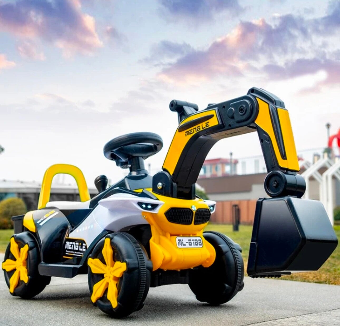 Dieses Bild zeigt ein Kinderfahrzeug, das wie ein kleiner Bagger gestaltet ist. Es hat eine auffällige gelbe und schwarze Farbgebung mit großen gelben Rädern. Der Bagger verfügt über einen Sitz mit Lenkrad und eine bewegliche Schaufel an der Vorderseite, die einem echten Baggerarm nachempfunden ist. Auf dem Fahrzeug sind die Aufschriften "METIS L.E" und "ML-8188" zu sehen. Dieses Spielzeug kombiniert Spielspaß mit einem realistischen Baustellen-Erlebnis, perfekt für kleine Bauarbeiter in spe.