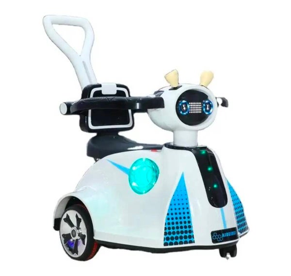 Dieses Bild zeigt ein futuristisches Kinderfahrzeug, das wie ein kleiner Roboter aussieht. Es hat ein weißes Gehäuse mit blauen und schwarzen Akzenten. Das Fahrzeug hat zwei große Räder und ein kleineres Rad vorne, was ihm Stabilität verleiht. Es gibt einen Griff an der Rückseite, der es ermöglicht, das Fahrzeug zu schieben oder zu lenken. Die Vorderseite des Fahrzeugs hat ein roboterähnliches Gesicht mit leuchtenden Augen und kleinen Antennen. An den Seiten befinden sich leuchtende Elemente, die das Fahrzeug besonders auffällig machen. Dieses Design ist interessant, weil es moderne Technologie und ein spielerisches Aussehen kombiniert, was es für Kinder attraktiv und unterhaltsam macht.