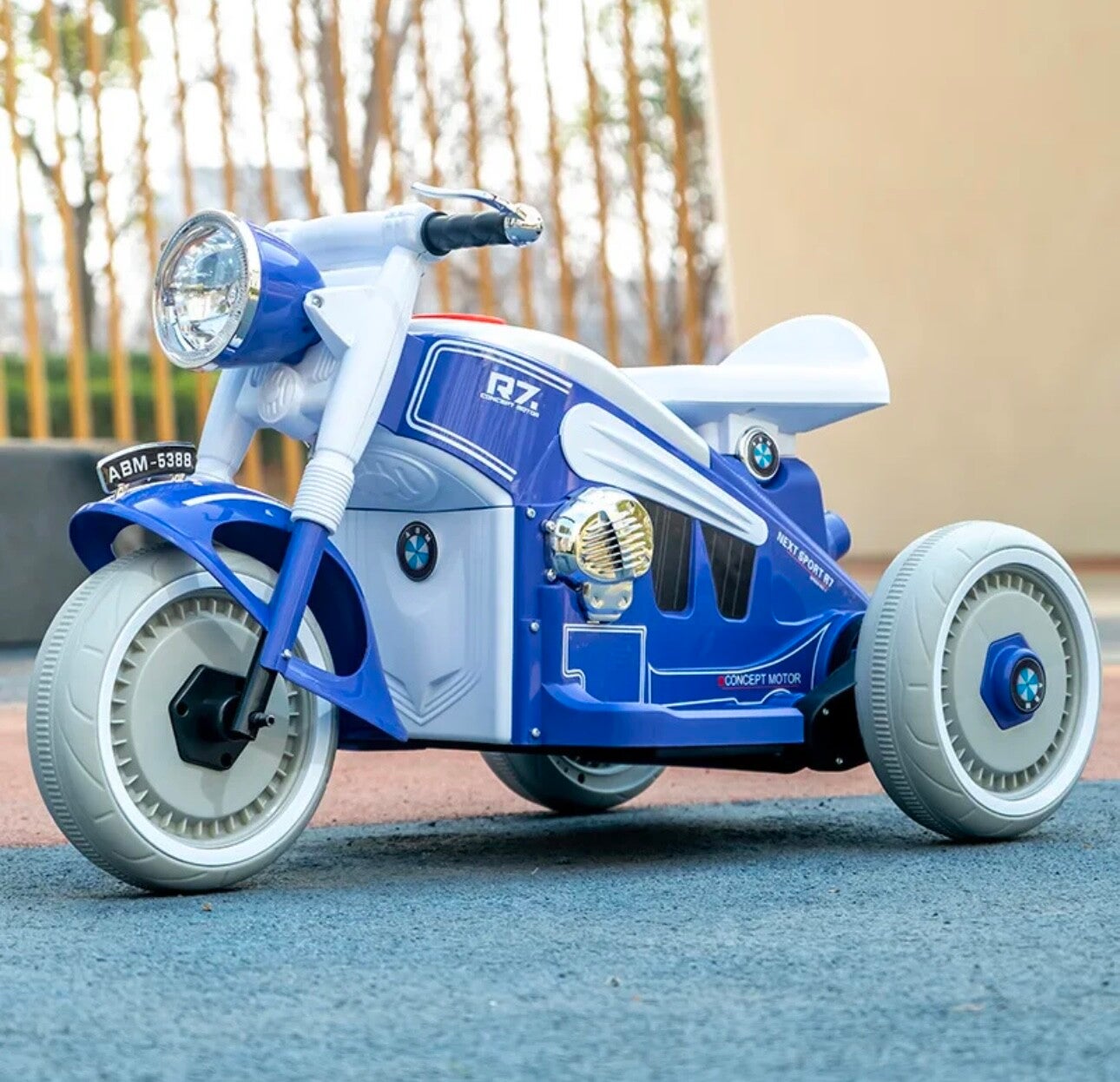 Dieses Bild zeigt ein dreirädriges Kinder-Elektromotorrad mit einem modernen und stilvollen Design. Die Farben Schwarz und Weiß werden durch goldene Akzente ergänzt, was dem Motorrad einen eleganten und zugleich sportlichen Look verleiht. Der runde, goldene Scheinwerfer auf der Vorderseite sorgt für ein klassisches Aussehen. Die Reifen haben weiße Streifen, die das sportliche Erscheinungsbild unterstreichen. Auf der Vorderseite befindet sich ein Nummernschild mit der Aufschrift "ABM-5988". Besonders auffällig ist das BMW-Logo, das für eine hochwertige Verarbeitung und Qualität steht. Dieses Motorrad ist ein faszinierendes Spielzeug, das sowohl Spaß als auch Stil bietet.