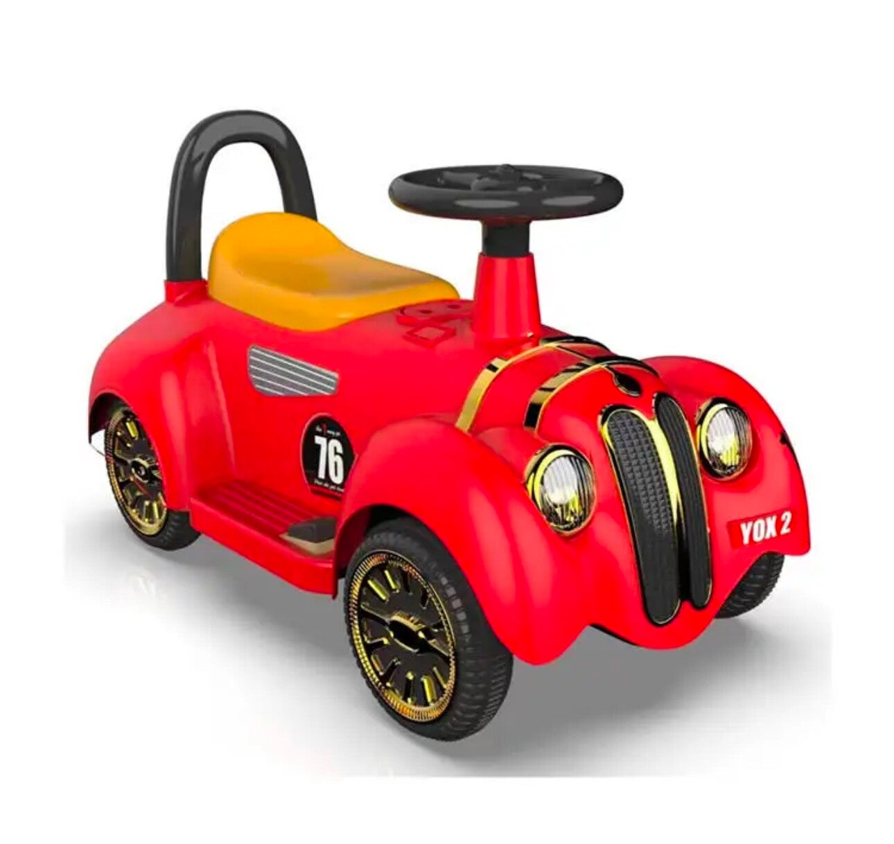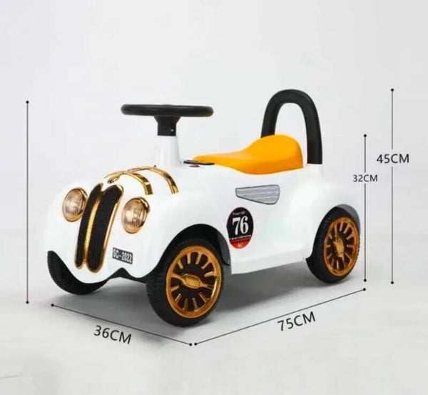 Dieses Spielzeugauto für Kinder, der "Mini Racer", besticht durch sein stilvolles Design in Weiß mit goldenen Akzenten. Ausgestattet mit einem schwarzen Lenkrad und einem bequemen orangefarbenen Sitz sowie einer schwarzen Rückenlehne, bietet es nicht nur Spielspaß, sondern auch Komfort. Die Maße des Fahrzeugs sind wie folgt: 75 cm Länge, 36 cm Breite, 45 cm Höhe bis zur Oberkante der Rückenlehne und 32 cm Höhe bis zur Oberkante des Sitzes. Auf der Seite des Autos prangt ein Aufkleber mit der Nummer "76" und das Nummernschild vorne trägt die Aufschrift "SC-2022". Dieses detailreiche Auto ist perfekt für kleine Abenteurer und fördert spielerisch die motorischen Fähigkeiten.