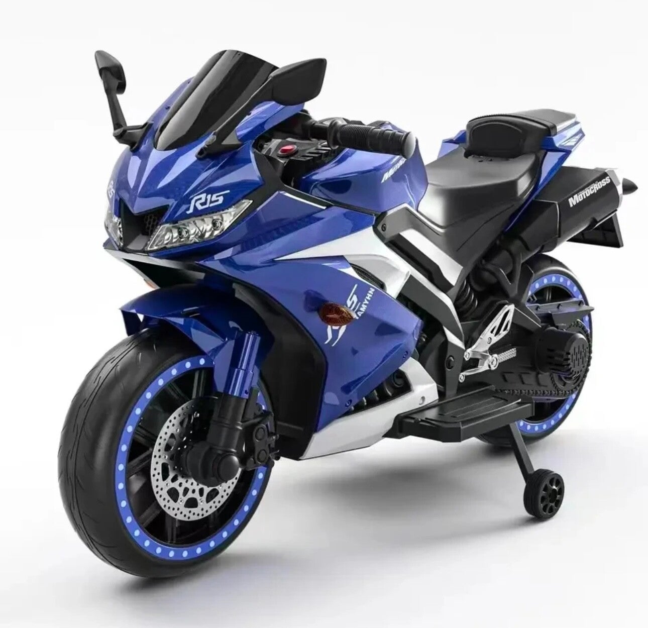 Dieses Motorradmodell, bezeichnet als "R15", besticht durch sein modernes und sportliches Design. Es hat eine weiße Karosserie mit blauen Akzenten an den Reifen, die durch die blauen Leuchtstreifen einen futuristischen Look erzeugen. Ausgestattet ist das Motorrad mit einem großen Frontscheinwerfer, einem schwarzen Windschutz und Seitenspiegeln. An der Seite des Motorrads ist ein Logo mit der Aufschrift "Montacross" zu sehen, das dem Gesamtbild eine elegante Note verleiht. Ideal für alle, die Stil und Leistung in einem Fahrzeug suchen.